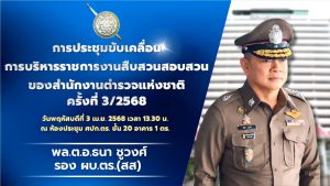 เมื่อ 3 เม.ย.68 เวลา 13.30 น. ตร.จัดประชุมขับเคลื่อนการบริหารราชการงานสืบสวนสอบสวน ผ่านระบบ Zoom ณ ห้องประชุม TOC ศปก.ตร.ชั้น 20 อาคาร 1 ตร. โดยมี พล.ต.อ.ธนา ชูวงศ์ รอง ผบ.ตร. (สส) เป็นประธานการประชุม บก.ตชด.ภาค 3 พ.ต.อ.วิศาลพงศ์ สร้อยกุลบดี รอง ผบก.ตชด.ภาค 3 และ พ.ต.ท.สุขสันต์ อินทร์สุข สว.ฝอ.บก.ตชด.ภาค 3 เข้าร่วมเฝ้าฟัง ณ ที่ตั้งหน่วย