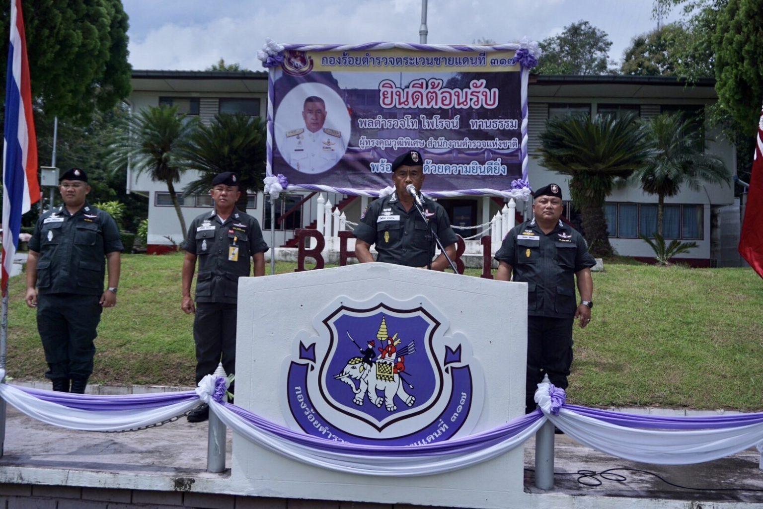 เมื่อ 22 ก.ย.66 เวลา 12.10 น. พล.ต.ต.ประกอบ พลเตชา ผบก.ตชด.ภาค 3 พร้อมด้วย พ.ต.อ.อภิชาติ รักพงษ์ ผกก.ตชด.31 ร่วมต้อนรับ พล.ต.ท.ไพโรจน์ ทานธรรม ผู้ทรงคุณวุฒิพิเศษ ตร./รอง ผบช.ตชด. ได้เดินทางมาตรวจเยี่ยมกองร้อย ตชด.317 บ.ห้วยเหล่า ต.นาขุม อ.บ้านโคก จว.อุตรดิตถ์ และเป็นประธานพิธีเปิดห้องประชุมทานธรรม โดย พล.ต.ท.ไพโรจน์ ทานธรรม ผู้ทรงคุณวุฒิพิเศษ ตร./รอง ผบช.ตชด. ได้กล่าวให้โอวาทกำลังพล ให้แนวทาง กำชับกำลังพลเกี่ยวกับ การขับเคลื่อนงานป้องกันชายแดน การป้องกันปราบปรามห้ามมิให้ใช้อำนาจหน้าที่ในการแสวงหาผลประโยชน์ การสร้างความเชื่อมั่นให้กับหน่วยงานต่างๆ ในพื้นที่ โดยมี พ.ต.ต.จิรวัฒน์ ภักดิ์วัฒนโภคิน ผบ.ร้อย 317 และข้าราชการตำรวจร่วมให้การต้อนรับ