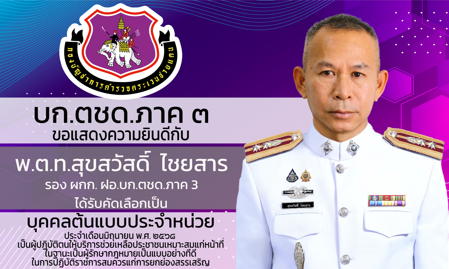 โครงการ “บุคคลต้นแบบประจำหน่วย” ที่ปฏิบัติตนให้บริการช่วยเหลือประชาชนเหมาะสมแก่หน้าที่ในฐานะเป็นผู้รักษากฎหมาย ต้องรักษาวินัยตามระเบียบแบบแผนของสำนักงานตำรวจแห่งชาติอย่างเคร่งครัด