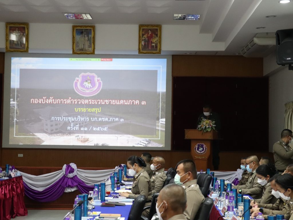 เมื่อ 041330 พ.ย.65 พล.ต.ต.ประกอบ พลเตชา ผบก.ตชด.ภาค 3 เป็นประธานการประชุมบริหาร บก.ตชด.ภาค 3 ครั้งที่ 11 ได้มอบนโยบายและกำชับข้อราชการที่รับมอบมาจากการประชุมบริหาร บช.ตชด. การประชุมบริหาร ตร. เมื่อวันที่ 2 พ.ย.65 และ 3 พ.ย.65 ตามลำดับ พร้อมนี้ได้ร่วมประชุมรับมอบนโยบายจาก พล.ต.ต.ไพโรจน์ ทานธรรม รอง ผบช.ตชด. ซึ่งได้เดินทางมาประชุมมอบนโยบายการปฏิบัติงาน ณ ห้องประชุมดารารัศมี 3 บก.ตชด.ภาค 3 เกี่ยวกับยุทธศาสตร์ด้านการป้องกันและปราบปรามยาเสพติด ให้มีการจัดตั้งศูนย์ยาเสพติดเพื่อขับเคลื่อนในการสกัดกั้นรับมือแก้ปัญหาภัยคุกคามด้านยาเสพติด ให้มีผลการจับกุมที่เป็นรูปธรรมชัดเจน ให้กำหนดเป้าหมายในการปฏิบัติเกี่ยวกับด้านที่ส่งผลกระทบต่อความมั่นคง มีการจัดทำข่าวกรองอาชญากรรมเพื่อใช้ขับเคลื่อนในการปฏิบัติให้เป็นรูปธรรม ให้มีการมวลชนสัมพันธ์และกำชับให้มีการกำกับดูแลความประพฤติ มีมาตรการในการควบคุมหน่วย โดยมีผู้บังคับบัญชาหรือผู้แทน หน.กลุ่มงานในส่วนของ ฝอ.บก.ตชด.ภาค 3, ผกก.ตชด.31-34, สว., ผบ.ร้อย ในส่วนที่เกี่ยวข้องเข้าร่วมประชุมโดยพร้อมเพรียงกัน