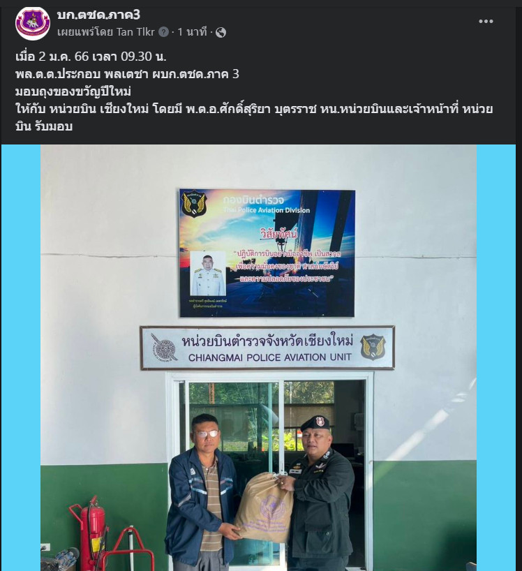 ให้กับ หน่วยบิน เชียงใหม่ โดยมี พ.ต.อ.ศักดิ์สุริยา บุตรราช หน.หน่วยบินและเจ้าหน้าที่ หน่วยบิน รับมอบ