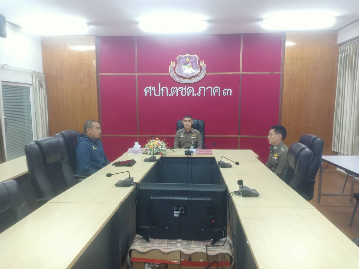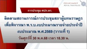 เมื่อ 30 พ.ค. 68 เวลา 18.30 น. พ.ต.อ.วิศาลพงศ์ สร้อยกุลบดี รอง ผบก.ตชด.ภาค 3, พ.ต.ท.วิมาณ ฉิมพล สว.ฝอ.บก.ตชด.ภาค 3 (ผงป.), พ.ต.ต.ณัฐกฤต เกรียงวานิช สว.ฝอ.บก.ตชด.ภาค 3 (กบ.) พร้อมด้วยเจ้าหน้าที่งานที่เกี่ยวข้อง เข้าร่วมการประชุมติดตามสถานการณ์การประชุมสภาผู้แทนราษฎร เพื่อพิจารณา พ.ร.บ.ร่างงบประมาณรายจ่ายประจำปีงบประมาณ พ.ศ.2569 (วาระที่ 1) โดยมี พล.ต.ท.กฤษฎา สุรเชษฐพงษ์ ผู้ช่วย ผบ.ตร. เป็นประธาน ศอ.สน.รัฐสภา,