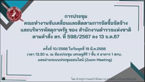 เมื่อ 19 มี.ค.68 เวลา 13.30 น. พ.ต.อ.วิศาลพงศ์ สร้อยกุลบดี รอง ผบก.ตชด.ภาค 3 พร้อมด้วย พ.ต.ท.นพดล จันทร์ฉ่อง สว.ฝอ.ฯ, ร.ต.อ.พันไมล์ ตานุ รอง สว.ฝอ.ฯ และเจ้าหน้าที่ มว.งานจัดซื้อจัดจ้าง ร่วมประชุมคณะทำงานขับเคลื่อนและการติดตามการจัดซื้อจัดจ้างและบริหารพัสดุภาครัฐ ของ สำนักงานตำรวจแห่งชาติ ตามคำสั่ง ตร. ที่ 598/2567 ลง 13 ธ.ค.67 ครั้งที่ 10/2568 ผ่านระบบออนไลน์ (Zoom meeting) ณ ห้องประชุม ศปก.ตชด.ภาค 3 โดยมี พล.ต.ท.กฤษฎา สุรเชษฐพงษ์ ผู้ช่วย ผบ.ตร. (บร 4) เป็นประธานการประชุม