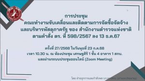 เมื่อ 23 ก.ค.68 เวลา 10.30 น. พ.ต.อ.วิศาลพงศ์ สร้อยกุลบดี รอง ผบก.ตชด.ภาค 3 พร้อมด้วย พ.ต.ต.ณัฐกฤต เกรียงวานิช สว.ฝอ.ฯ ร่วมประชุมคณะทำงานขับเคลื่อนและการติดตามการจัดซื้อจัดจ้างและบริหารพัสดุภาครัฐ ของ สำนักงานตำรวจแห่งชาติ ตามคำสั่ง ตร. ที่ 598/2567 ลง 13 ธ.ค.67 ครั้งที่ 27/2568 ผ่านระบบออนไลน์ (Zoom meeting) ณ ห้อง ศปก.บก.ตชด.ภาค 3 โดยมี พล.ต.ท.กฤษฎา สุรเชษฐพงษ์ ผู้ช่วย ผบ.ตร. (บร 4) เป็นประธานการประชุม