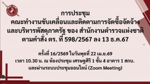 เมื่อ 22 เม.ย.69 เวลา 10.30 น. พ.ต.อ.วิศาลพงศ์ สร้อยกุลบดี รอง ผบก.ตชด.ภาค 3 พร้อมด้วย พ.ต.ต.ณัฐกฤต เกรียงวานิช สว.ฝอ.บก.ตชด.ภาค 3 (กบ.) ร่วมประชุมคณะทำงานขับเคลื่อนและการติดตามการจัดซื้อจัดจ้างและบริหารพัสดุภาครัฐ ของ สำนักงานตำรวจแห่งชาติ ตามคำสั่ง ตร. ที่ 598/2567 ลง 13 ธ.ค.67 ครั้งที่ 16/2569 ผ่านระบบออนไลน์ (Zoom meeting) ณ ห้องประชุม ศปก.ตชด.ภาค 3 โดยมี พล.ต.ท.กฤษฎา สุรเชษฐพงษ์ ผู้ช่วย ผบ.ตร. (บร 3) เป็นประธานการประชุม