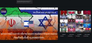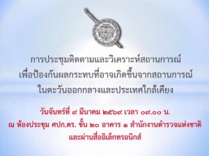 เมื่อ 9 มี.ค.69 เวลา 09.00 น. พ.ต.อ.วิศาลพงศ์ สร้อยกุลบดี รอง ผบก.ตชด.ภาค 3 พร้อมด้วย พ.ต.ท.วิมาณ ฉิมพล สว.ฝอ.บก.ตชด.ภาค 3(ผงป.) พ.ต.ท.สุขสันต์ อินทร์สุขเข้าร่วมประชุมติดตาม สถานการณ์ประเทศในตะวันออกกลางและใกล้เคียง ผ่านระบบ Zoom โดยมี พล.ต.ต.วีรพัฒน์ ศิวะแพทย์