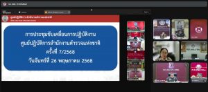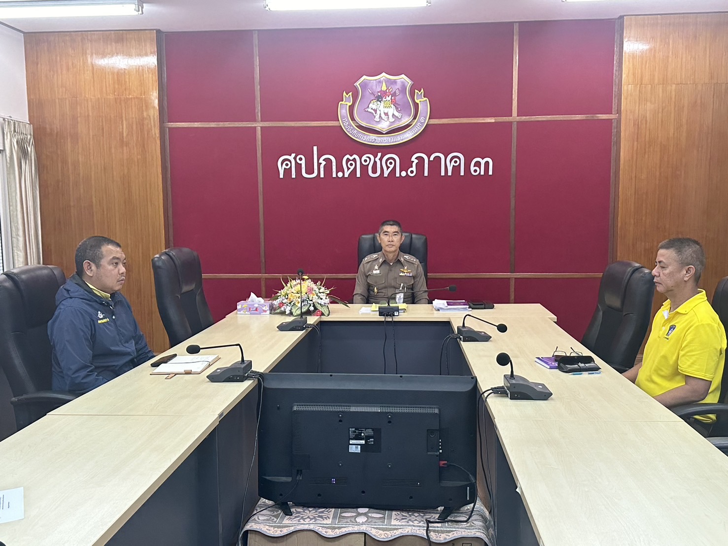 เมื่อ 26 พ.ค.68 เวลา 10.00 น. พ.ต.อ.วิศาลพงศ์ สร้อยกุลบดี รอง ผบก.ตชด.ภาค 3 พร้อมเจ้าหน้าที่ที่เกี่ยวข้อง เข้าร่วมประชุมทางไกล (video conference) ขับเคลื่อน ศปก.ตร. เฝ้าฟังติดตามสถานการณ์ ณ ห้องประชุม ศปก.ตชด.ภาค 3