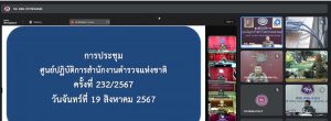 1. เมื่อ 19 ส.ค. 67 เวลา 09.00 น. พ.ต.อ.วิศาลพงศ์ สร้อยกุลบดี รอง ผบก.ตชด.ภาค 3 พร้อมด้วยเจ้าหน้าที่งานที่เกี่ยวข้อง เข้าร่วมประชุมทางไกล (video conference) ขับเคลื่อน ศปก.ตร. เฝ้าฟังติดตามสถานการณ์ ณ ห้องประชุม ศปก.ตชด.ภาค 3