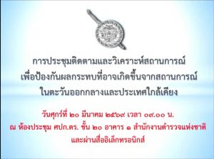 เมื่อ 20 มี.ค. 69 เวลา 09.00 น. พ.ต.อ.วิศาลพงศ์ สร้อยกุลบดี รอง ผบก.ตชด.ภาค 3 พร้อมด้วย พ.ต.ท.สุขสันต์ อินทร์สุข สว.ฝอ.บก.ตชด.ภาค 3 (ขว.), ร.ต.อ.อนุสรณ์ ปัญญา รอง สว.ฝอ.บก.ตชด.ภาค 3 (ทส.) และเจ้าหน้าที่ที่เกี่ยวข้อง เข้าร่วมประชุมทางไกล ศปก.ตร. ติดตามสถานการณ์ตะวันออกกลาง โดยมี พล.ต.ท. วิมล พิทักษ์บูรพา ผบช.สยศ.ตร. เป็นประธาน ณ ห้องประชุม ศปก.ตชด.ภาค 3