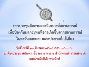 เมื่อ 23 มี.ค. 69 เวลา 09.00 น. พ.ต.อ.ศิระ ศรีศรากร รอง ผบก.ตชด.ภาค 3 พร้อมด้วย พ.ต.ท.สุขสันต์ อินทร์สุข สว.ฝอ.บก.ตชด.ภาค 3 (ขว.), พ.ต.ท.วิมาณ ฉิมพล สว.ฝอ.บก.ตชด.ภาค 3 (ผงป.) และเจ้าหน้าที่ที่เกี่ยวข้อง เข้าร่วมประชุมทางไกล ศปก.ตร. ติดตามสถานการณ์ตะวันออกกลาง โดยมี พล.ต.ต.วีรพัฒน์ ศิวแพทย์
