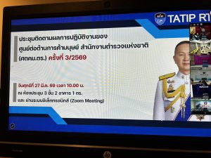 พ.ต.อ.อภิชาติ รักพงษ์ รอง ผบก.ตชด.ภาค 3 พร้อมด้วย พ.ต.ท.วิมาณ ฉิมพล สว.ฝอ.ฯ (ผงป.) เข้าร่วมเฝ้าฟังการประชุมติดตามผลการปฏิบัติงานของ ศตคม.ตร. ครั้งที่ 3/2569 โดยมี พล.ต.อ.ธัชชัย ปิตะนีละบุตร รอง ผบ.ตร./ ผอ.ศตคม.ตร. เป็นประธานการประชุม