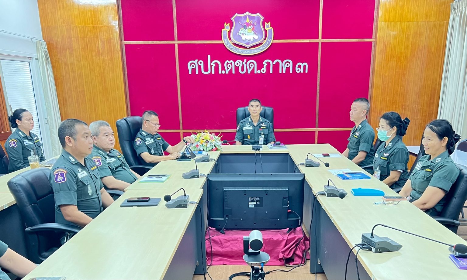 เมื่อ 4 ก.ค.67 เวลา 10.30 น. พ.ต.อ.วิศาลพงศ์ สร้อยกุลบดี รอง ผบก.ตชด.ภาค 3 พร้อมด้วย รอง ผกก.ฝอ.บก.ตชด.ภาค 3, สว.ฝอ.บก.ตชด.ภาค 3, ผบ.ร้อย สสน.ฝอ.บก.ตชด.ภาค 3 เเละ จนท.ที่กี่ยวข้อง ร่วมเฝ้าฟังการประชุมมอบนโยบายเเละตรวจเยี่ยมการปฏิบัติราชการ บช.ตชด. จาก พล.ต.ท.ประจวบ วงศ์สุข ผู้ช่วย ผบ.ตร.รรท.รอง ผบ.ตร.(มค.) ด้วยระบบทางไกลผ่านจอภาพ ณ ห้องประชุม ศปก.ตชด.ภาค 3