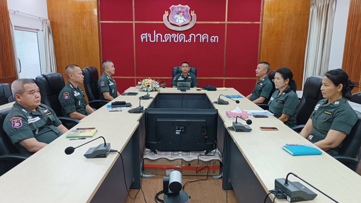 เมื่อ 10 ก.ค.67 เวลา 10.00 น. พ.ต.อ.รังสิมันต์ สงเคราะห์ธรรม รอง ผบก.ตชด.ภาค 3, พ.ต.อ.อภิชาติ รักพงษ์ รอง ผบก.ตชด.ภาค 3 พร้อมด้วย รอง ผกก.ฝอ.บก.ตชด.ภาค 3, สว.ฝอ.บก.ตชด.ภาค 3 เเละ ผบ.ร้อย สสน.ฝอ.บก.ตชด.ภาค 3 ร่วมเฝ้าฟังการประชุมมอบนโยบายการปฏิบัติราชการเเละรับการตรวจเยี่ยม บช.ตชด. จาก พณฯ เศรษฐา ทวีสิน นายกรัฐมนตรี ด้วยระบบทางไกลผ่านจอภาพ ณ ห้องประชุม ศปก.ตชด.ภาค 3