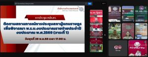 เมื่อ 28 พ.ค. 68 เวลา 17.00 น. พ.ต.อ.วิศาลพงศ์ สร้อยกุลบดี รอง ผบก.ตชด.ภาค 3, พ.ต.ท.วิมาณ ฉิมพล สว.ฝอ.บก.ตชด.ภาค 3 (ผงป.) พร้อมด้วยเจ้าหน้าที่งานที่เกี่ยวข้อง เข้าร่วมการประชุมติดตามสถานการณ์การประชุมสภาผู้แทนราษฎร เพื่อพิจารณา พ.ร.บ.ร่างงบประมาณรายจ่ายประจำปีงบประมาณ พ.ศ.2569 (วาระที่ 1) โดยมี พล.ต.ท.กฤษฎา สุรเชษฐพงษ์ ผู้ช่วย ผบ.ตร. เป็นประธาน ศอ.สน.รัฐสภา,