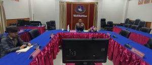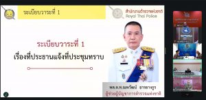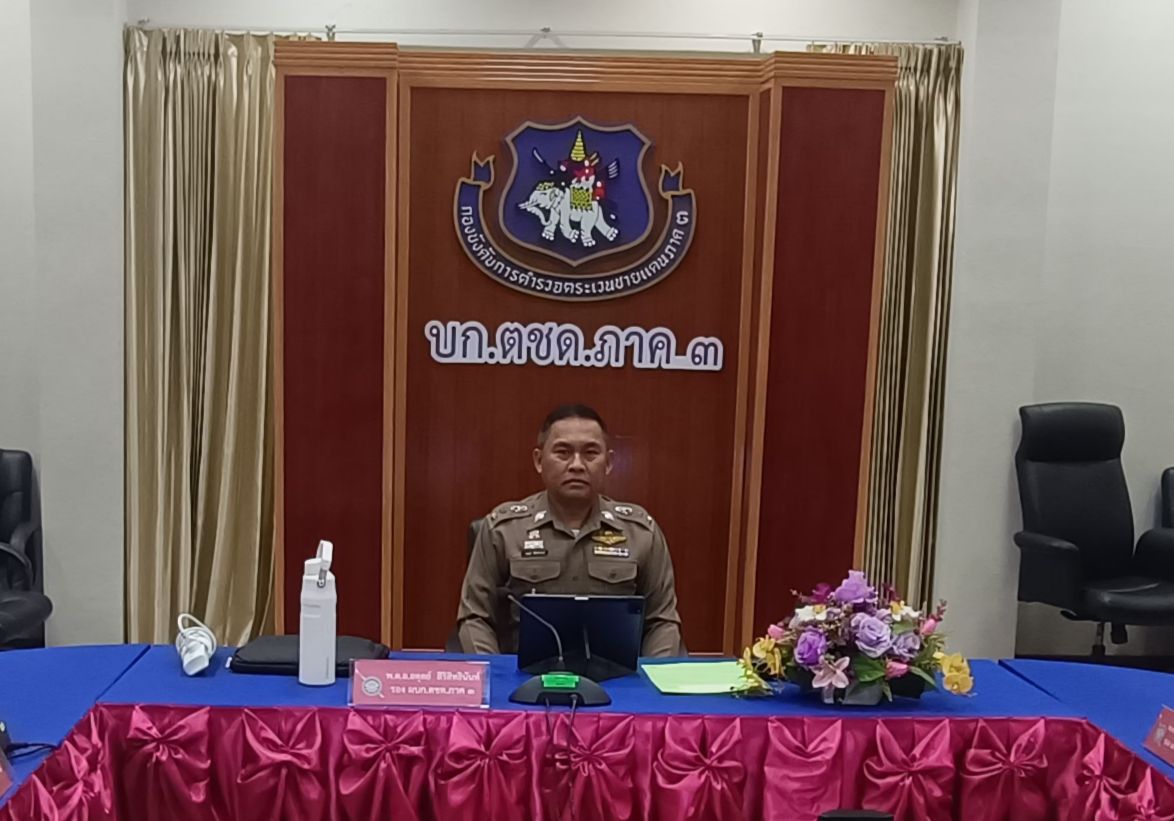 พ.ต.อ. อดุลย์ สิริสิทธินันท์ รอง ผบก.ตชด.ภาค 3 พร้อมกับ ร.ต.อ.แพรวนภา แซ่เตีย รอง สว.ฝอ.บก.ตชด.ภาค 3 (นกว.) เฝ้าฟังประชุมวีดีโอทางไกลผ่านจอภาพ งานเร่งรัดคดีวินัย ตร.
