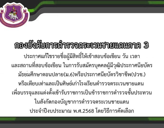 สงวนลิขสิทธิ์ 2569 กลุ่มงานเทคโนโลยีสารสนเทศ ฝ่ายอำนวยการ กองบังคับการตำรวจตระเวนชายแดนภาค 3